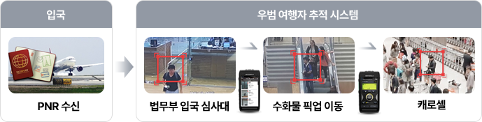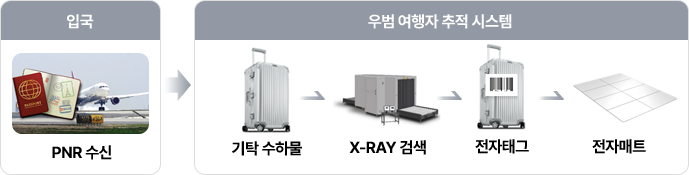 우범여행자 추적시스템은 공항 입국과정에서의 법무부 입국심사대 통과후 수화물 픽업과정에서의 선별된 우범 여행자에 대한 추적 관찰을 통해